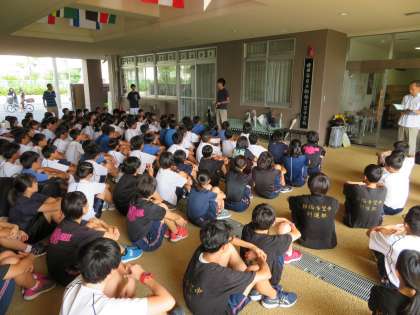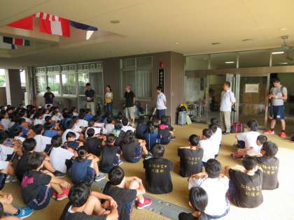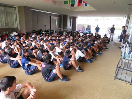 部活動合宿の出発式の様子です。参加するどの部活動も2年生が最上級生です。1年生をリードして、集団として成長できることに期待しています。(田村真)