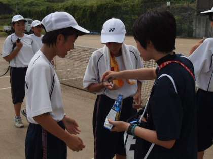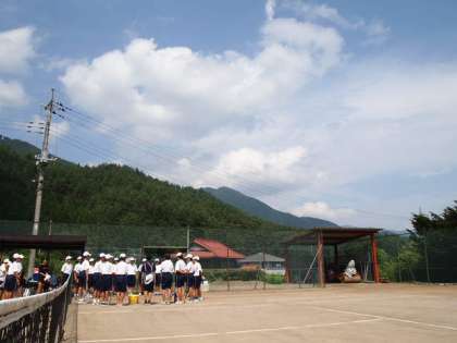 今回から参加している硬式テニス部です。見渡す限りの自然に囲まれたテニスコートで合宿1日目が始まりました。東京に比べ明らかに違うのは紫外線の強さ。肌にじりじりときます。塩飴を食べ、スポーツドリンクを沢山用意して熱中症対策に万全の態勢で臨みます。