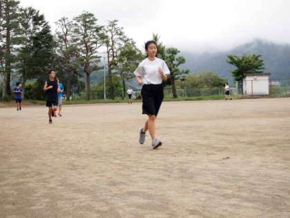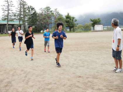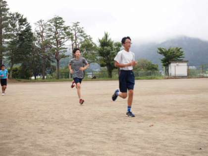 剣道部は園庭に出てランニングから始まりました。涼しい気候のおかげか、どの部員の顔にも余裕の表情(?)が出ていました。