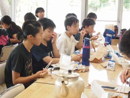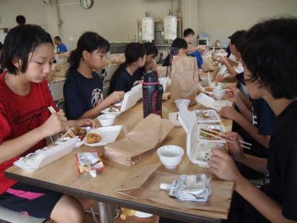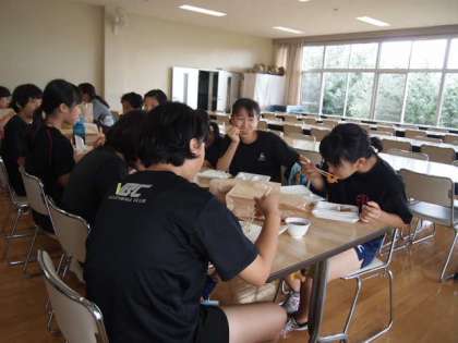 お昼はお弁当です。外のコートに行っているテニス部以外は食堂で食べています。お腹は空いているもののさすがにちょっと疲れが溜まりつつある生徒もいて、昨晩のカレーライスほどの勢いはなくなりました。