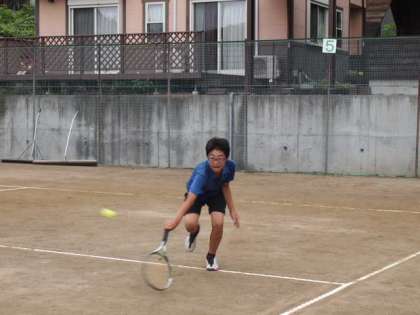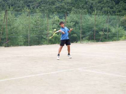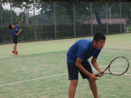 時々パラパラっと霧雨が降ってくる天候ですが、生徒は練習試合を楽しんでいるようです。その試合に望む課題をあげてサーブを出していました。