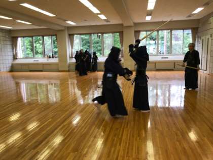 剣道部は防具をつけての打ち込み稽古を行なっています。気合いの入った大きな声が部屋いっぱいに跳ね返っています。 副校長