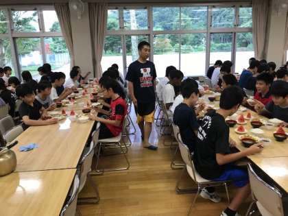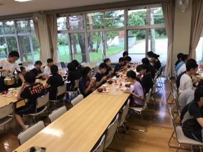 夕食の時間になりました。今日もたくさん活動してきたので、みんなしっかりと食べています。栄養と休息をとって、夜の活動に備えます。
