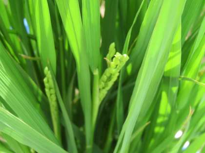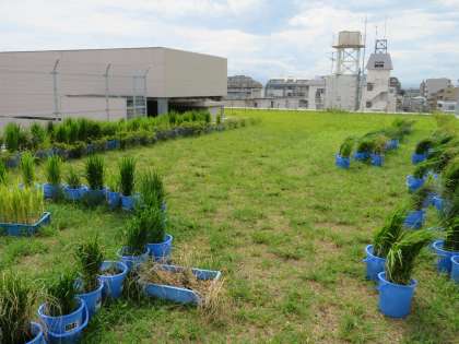 屋上の稲の様子です。今日は風が強い日でしたが、負けずに育っています。中には、穂がつき始めたものもあります。暑い日々が続きますが、負けずに頑張ってください。(田村真)