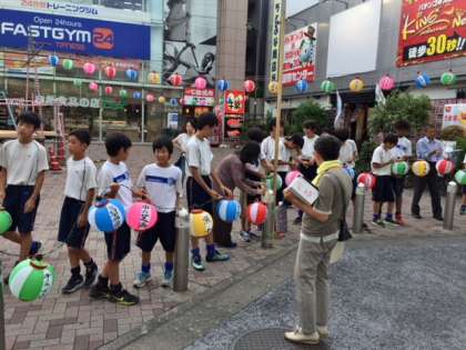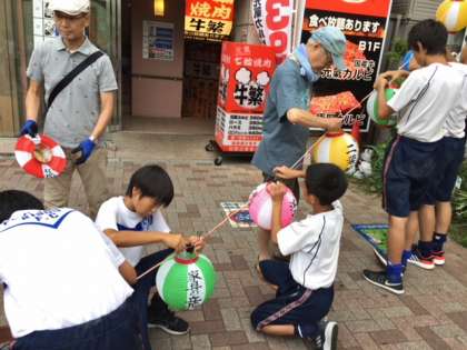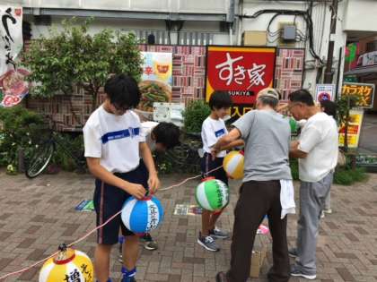 本校サッカー部の生徒が、盆踊りの提灯を取り付ける作業のお手伝いをしました。