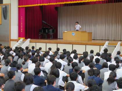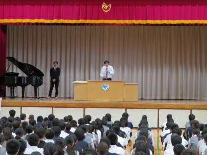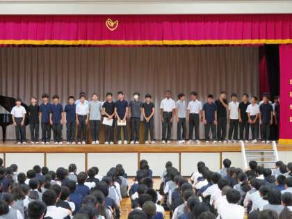 始業式に続いて、教育実習生の紹介がありました。9月からは2名の実習生が授業などに取り組みます。また、夏休みなどの部活動の表彰も行いました。(田村真)