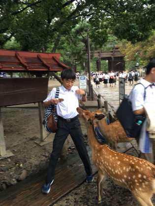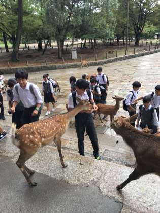 いきなり鹿の洗礼を浴びる生徒達。(市川)