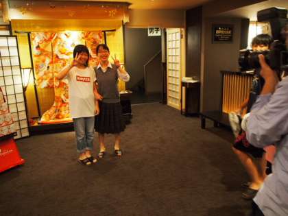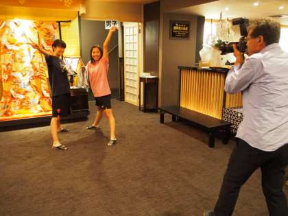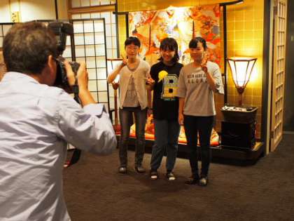 お腹一杯になった生徒たちは、ロビーに集まり写真屋さんに京都らしい西陣織の着物の前で記念撮影をお願いしていました。
