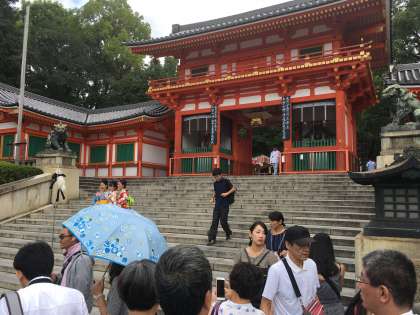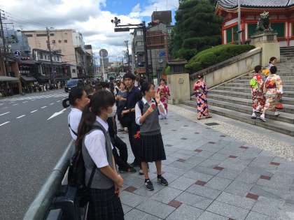八阪神社前にて、おやつタイム中の生徒に遭遇!バスが来てしまい、急いで乗り込んでいました。渡邉