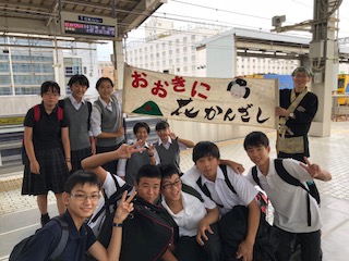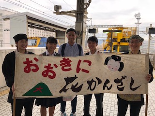 京都駅の新幹線ホームに旅館の花かんざしの方々が見送りに来てくださいました。(稲見)