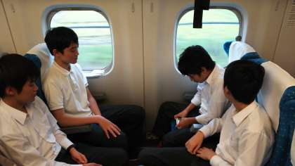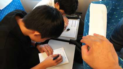 東京に向けて出発しました。早速トランプをする人もいれば、まず今日の日誌を書く人も。