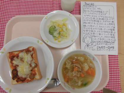 今日の給食では、厚めに切ったパンに具材をのせてボリュームたっぷりのピザトーストにしました!
