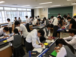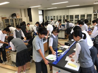 3年の理科の授業です。運動とエネルギーについて学んでいます。球体がレールを動き木片にぶつかる際の強さを、球体の速さ、質量、レールの長さを変えて計測します。グループで協力し意見を述べあいながらしっかりと取り組んでいます。(副校長)