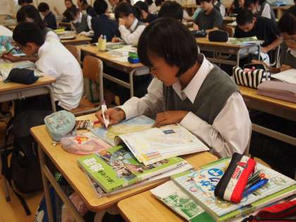 今日から「南アメリカ」の単元です。まず、この場所にちなんだ画像を見て、生徒の興味関心を高めます。主な都市、山脈や川などの地名を地図で確認したあと、雨温図などで南アメリカの自然や環境について学んでいきます。生徒たちは真剣に地名を確認したあとラインマーカーで印をつけていきました。