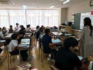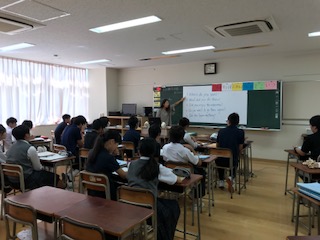 2年の英語の授業です。先週の職場体験についてを話題として授業を進めています。体験してきたことについて、何をしてきたの、何を学んだの、など先生や隣の人と英語で会話を進めています。(副校長)