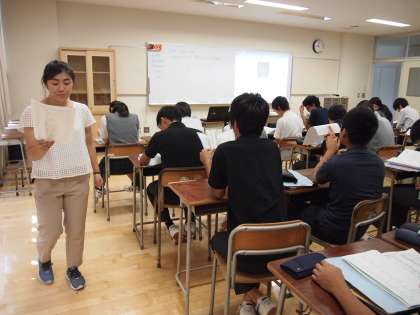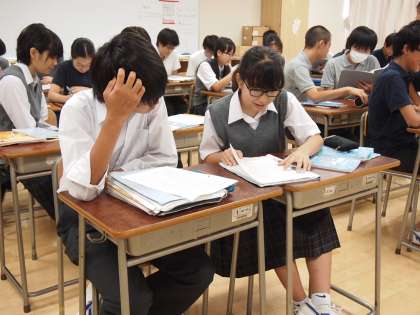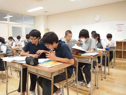英語の授業はいつもアクティブです。英文の歌詞で歌うことからはじまり、隣同士友達との英会話Q&A、そしてreadingとフナキボ生はみな積極的に参加しています。