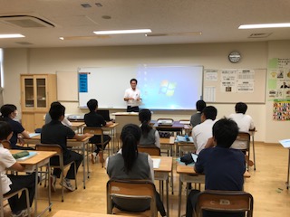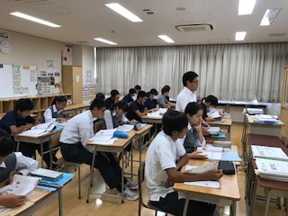 2年の英語の授業です。前半は前の時間に見学したのと同じ、職場体験についての会話をやりとりする学習が行われています。先生が違うと学習の流れも違ってくるものですね。でも、どちらの授業も生徒たちは、先生からのサポートを受けながら頑張って英語で会話をしていました。(副校長)