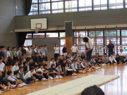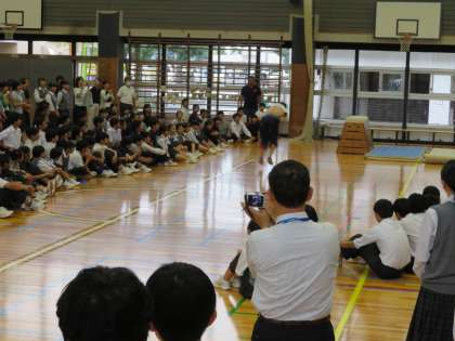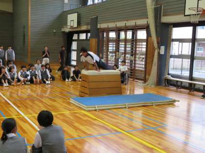 本日昼休み、体育館で教育実習生による体操の実演がありました。各学年からも多くの見学者が集まり、鞍馬や床の技を披露してくれました。実習期間も明日で最後なので、ぜひ船橋希望中学校での実習の最後を締めくくってください。(田村真)