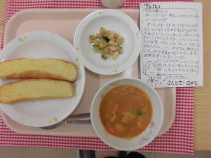「ガーリックトースト」はソフトフランスパンを焼き、そのパンを2つに切ってそれぞれガーリックバターをぬってさらに焼いてトーストにしました。にんにくには、たんぱく質やビタミンB1,B2,C、ナイアシン、カルシウム、リン、カリウム、鉄などいろいろな栄養が含まれています。疲労回復にも効果がある食材です。
