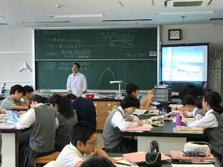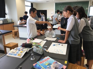 1年の理科の授業です。大気圧について学んでいます。大気圧の力を知るために、水を入れた容器の口に葉書を押さえ、逆さにしても葉書が落ちないという実験では、水の量が多めでも少なめでも落ちないのか自主的に研究を進めているグループもありました。(副校長)