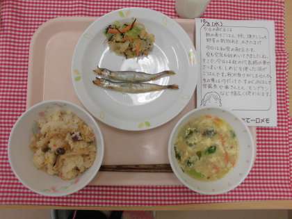 この頃空も空気も秋めいてきました。そこで、今日は秋の代表格の栗やさつまいも、しめじを使った混ぜごはんを出しました。秋の香りがする、ボリュームたっぷりのごはんです。