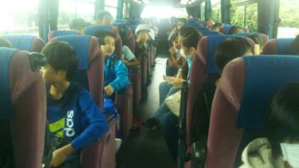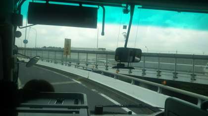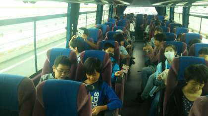 高速道路に入りました。バスレクが盛り上がっています。(田村真)