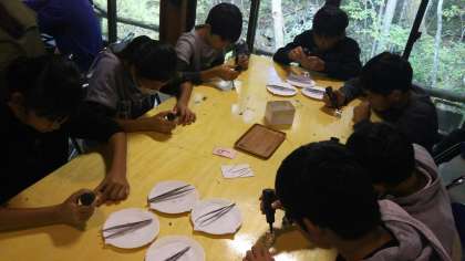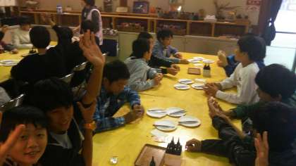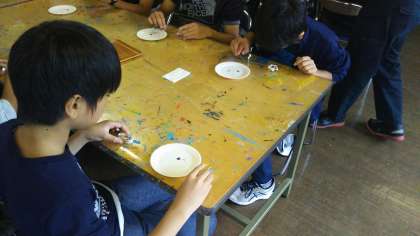 クラフト体験の様子です。ペーパーウェイトを集中して作成しています。(田村真)