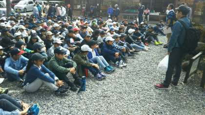フィールドワークとクラフト体験を終えて河口湖フィールドセンターを出発します。次はレーダードームに向かいます。(田村真)