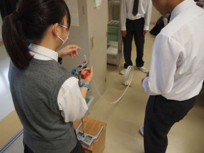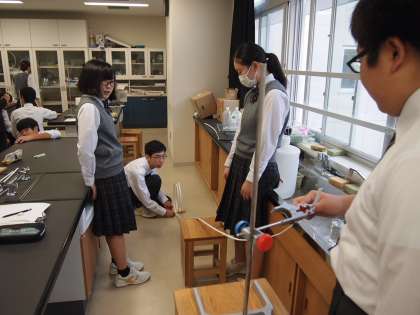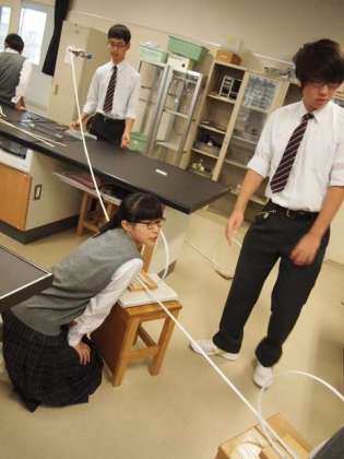 1年生が富士山の麓でオリエンテーリングを頑張っている一方、学校ではフナキボ生が授業に真剣に取り組んでいます。理科室では3年生がエネルギー実験の真っ最中。‘ジェットコースター’を再現したレールに玉を転がし、距離、角度、形状を様々に設定してどうしたらレールからそれることなく、最後まで玉が転がっていくかを確かめています。