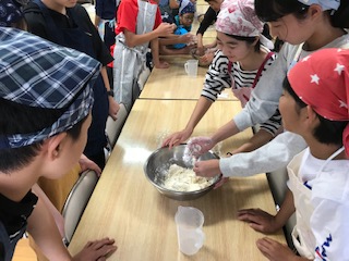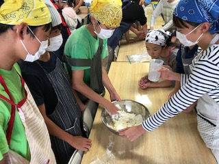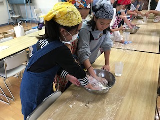 小麦粉と塩をこねて生地を作ります。教員チームも頑張って作っています。(副校長)