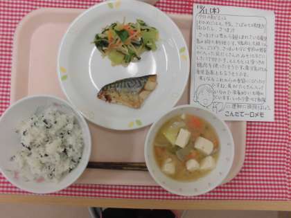 「さつま汁」は、鹿児島県で昔から親しまれている郷土料理です。鶏肉と大根、にんじん、ごぼう、さつまいもなどの季節の野菜がたっぷり入ったみそ仕立ての汁物です。鹿児島汁とか鹿児島煮とも呼ばれるそうです。鶏肉は元々骨付きのものを使うそうですが、給食では骨が入っていないものでつくりました。具だくさんで栄養的にも優れているメニューですね。