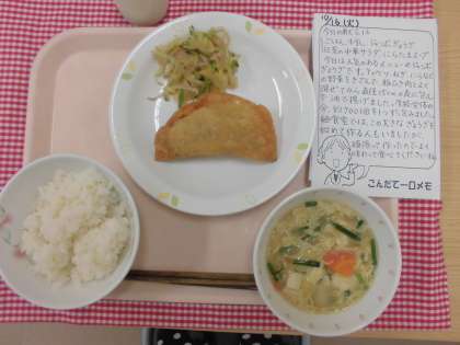 今日は人気のあるメニューのジャンボぎょうざです。キャベツ、ねぎ、にらなどの野菜をきざんで、豚ひき肉とよく混ぜてから直径15 cmの皮に包んで油で揚げました。学校全体で約700個分を1つずつ手で丁寧に包みました。給食室では、この大きさのぎょうざを初めて作る人もいましたが、一生懸命つくりました。