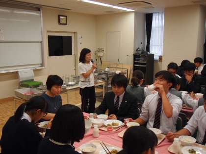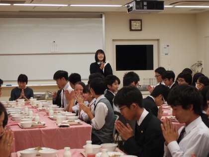 ランチルーム給食です。ここで食べる時は、教室にはない特別のデザートが付きます。「今日は座席も男女で向き合う合コン付き」と給食委員の生徒が紹介していました!栄養士から今日のメニューについての紹介がありました。