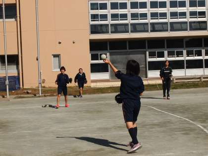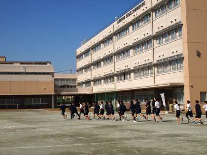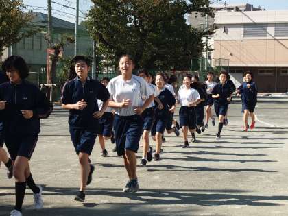 準備運動の後はランニングです。「いーち、にー、いち、にっ、さんっ!」と2クラスに分かれて集団が声と気持ちを合わせた掛け声が校庭に響きます。この声を聞くと「フナキボ生、頑張っているなあ」と思わず気持ちが引き締まります。