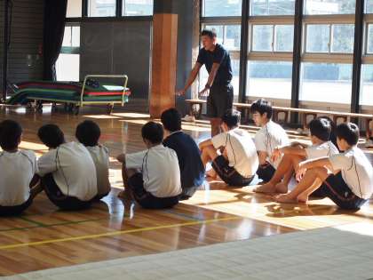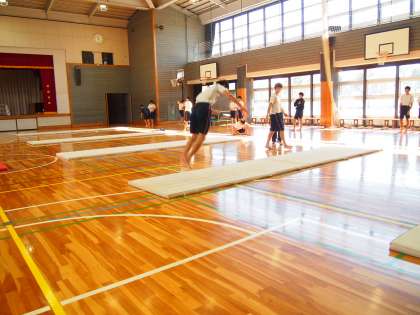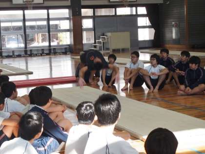 3年体育はマット運動です。体育の授業でも特に怪我に気をつけて行う種目と言われていますが、今日は教科担当が入念に注意すべきポイントを話しをしたあと、自らお手本を見せました。3年生から「お〜っ!」という歓声があがりました。