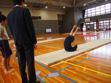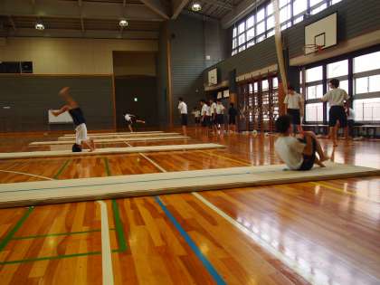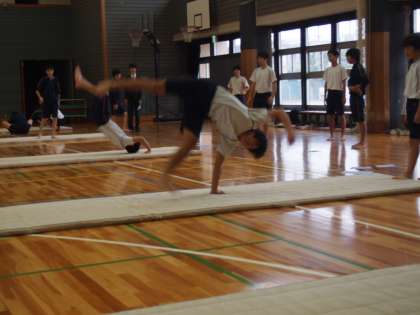 生徒が全力で取り組んだ昨日の学芸発表会から一夜開けた今日の学校は、またいつものフナキボの姿に戻っています。体育館では3年生男子が個人の課題別マット運動に取り組んでいます。昨日の疲れも見せず、全身を使って頑張っている姿からは中学生の底力を感じました。