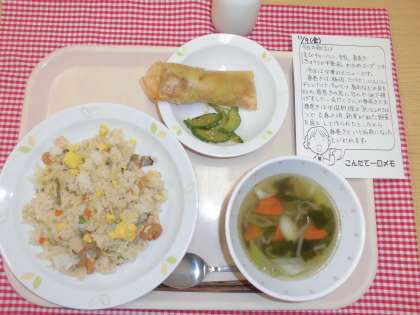 「春巻き」は、豚肉やたけのこ、にんじん、干ししいたけ、キャベツ、春雨などの具を炒めた後、1つ1つ春巻きの皮で包んで油で揚げました。具だくさんの春巻きです。味わって食べてくれるとうれしいです。春巻きは中国料理の点心の1つで、立春の頃新芽が出た野菜を具として作られたことから「春巻き」という名前になったそうです。