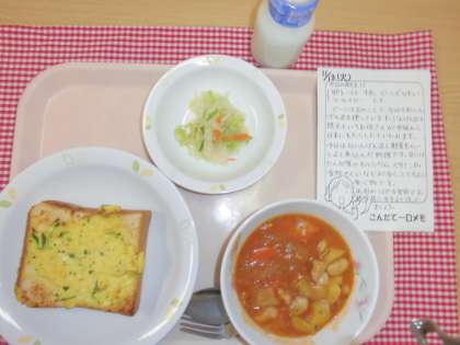 今日の「ビーンズシチュー」は白いんげん豆と野菜をよく煮込んでつくりました。いんげん豆は隠元というお坊さんが中国から日本にもたらしたといわれています。タンパク質が豊富で、カルシウムやビタミンB、食物せんいなども取ることができる食材です。