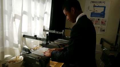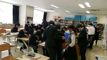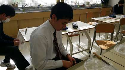 2年生の美術の授業では、ペーパーナイフを作成しています。ナイフの形は個人で決めることができ、猫の形やハートの形など、それぞれ思い思いにナイフを形づくっていました。集中力が必要な作業もあるので、みんな真剣です。