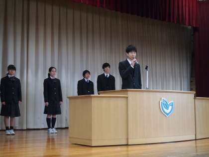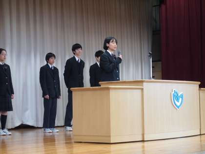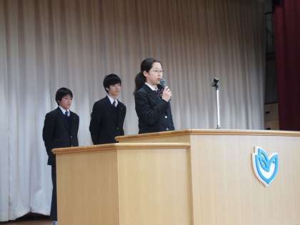 今朝の生徒会朝礼。いつものように‘原稿なし’で生徒会長はじめ、各委員長が自分の言葉でフナキボ生に呼びかけています。落ち葉掃きの日程を告知して参加を呼びかけたり、きれいな校舎をよりきれいに使うことへの決意をしめしたり、冬に向かう今の時期にウィルスへの対策を具体的に示したり、と分かりやすく伝える意気込みを感じました。