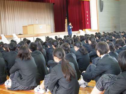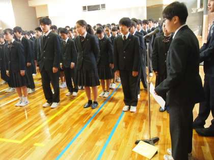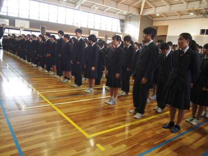 朝の冷え込みが厳しくなり、家を出る時間が多少遅くなりがちなのはおとな社会でも同じです。ましてや月曜日。大方の生徒が集合した体育館に、後ろから何名かの生徒が走って列に入ります。それでも、チャイムがなる2分前にはいつものように整列が完了。体育館は600名以上が集まっているとは思えない静寂に包まれました。