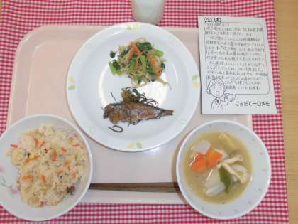 「吹き寄せごはん」は何種類もの具材を彩りよく盛り合わせたごはんです。「吹き寄せ」とは、秋にさまざまな色や形の木の葉が風で一か所に吹き寄せられる様子を表したものです。今回はにんじんやしめじなど秋らしい具材をたたくさんいれたごはんにしました。