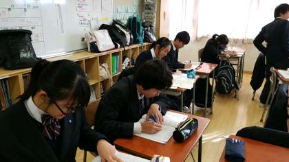 2年生の昼休みの様子です。教室で課題に取り組んだり、友達とおしゃべりに興じたり、期末テストの点数を教えあって一喜一憂している様子がありました。
