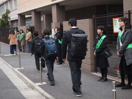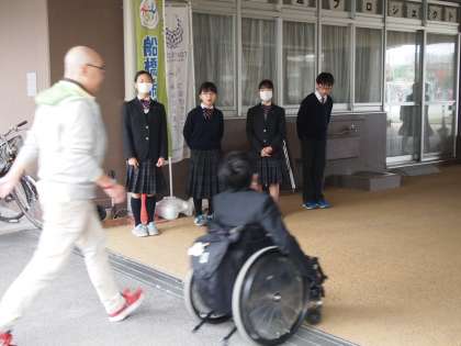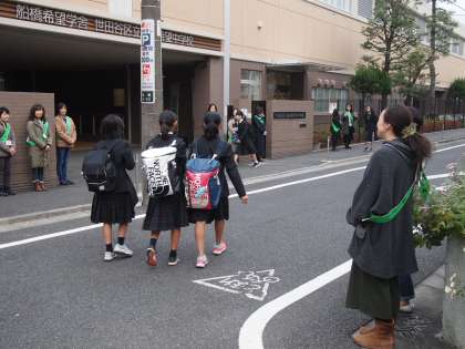 今日の1年5組の保護者の方によるあいさつ運動は11人が参加してくださり、いつも以上にあちらこちらであいさつが交わされていました。そしてピロティーでは生徒会が「おはようございます!」の声を出してフナキボ生を迎えていました。