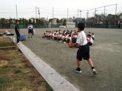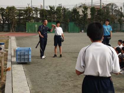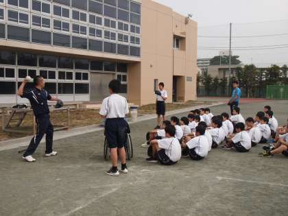 1年生体育はソフトボールです。投げ方の基本を野球部に所属している生徒がやっています。みんなの前でやってみて、具体的に言葉で注意事項を伝えました。