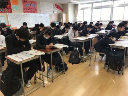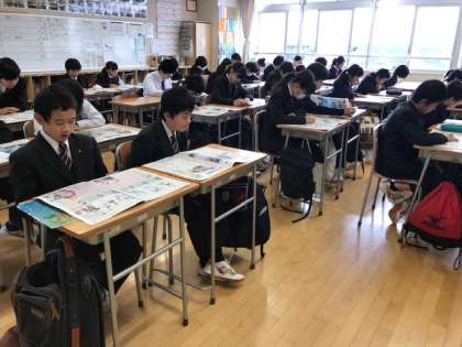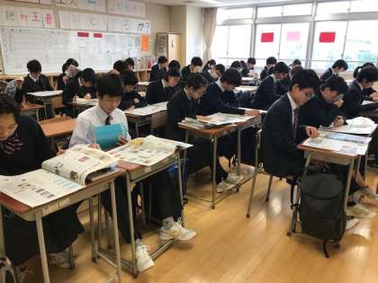 本日は月に一度のNIEタイムです。どのクラスも、黙々と記事を読む生徒たちの姿が見られました。私が見た感じでは、開いていた紙面に大きな偏りはなかったですが、「今年の10大ニュース」に見入っていた生徒がやや目につきました。今年もいろいろありましたね。(副校長)
