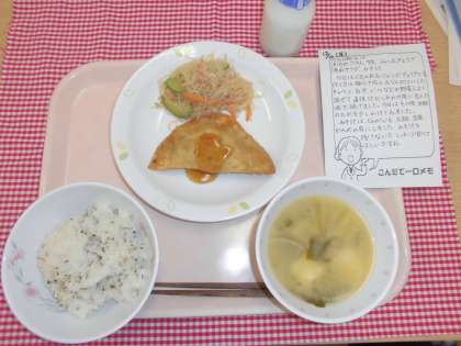 「ジャンボぎょうざ」は、豚ひき肉とみじん切りしたキャベツ、ねぎ、にらなどの野菜をよく混ぜて直径15センチの皮に包んで油であげてつくりました。今日は最後に上から甘酢のたれをかけてみました。