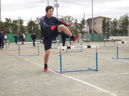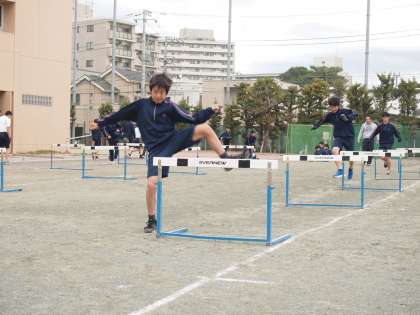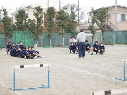 女子が冷え込んだ体育館でバスケットボールをやっている頃、男子は寒風が吹く校庭でハードルに挑戦です。飛び方もまずは形を覚えるため片足を抜く動作から始め、徐々にハードルを置く間隔も広げていきます。