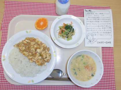 今日は中華風のメニューです。麻婆豆腐をごはんにかけて頂きます。