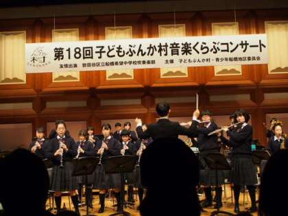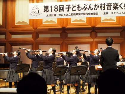 毎年この時期に成城ホールで行われている「子どもぶんか村 音楽クラブコンサート」に今年もフナキボ吹奏楽部が友情出演しました。地域の行事に出演するごとに演奏が上手くなっていく吹奏楽部ですが、今日もクラシック音楽とヒットメドレーんを織り混ぜ、しっかりした音程でかつ楽しい演奏を披露し、会場から大きな拍手をいただきました。